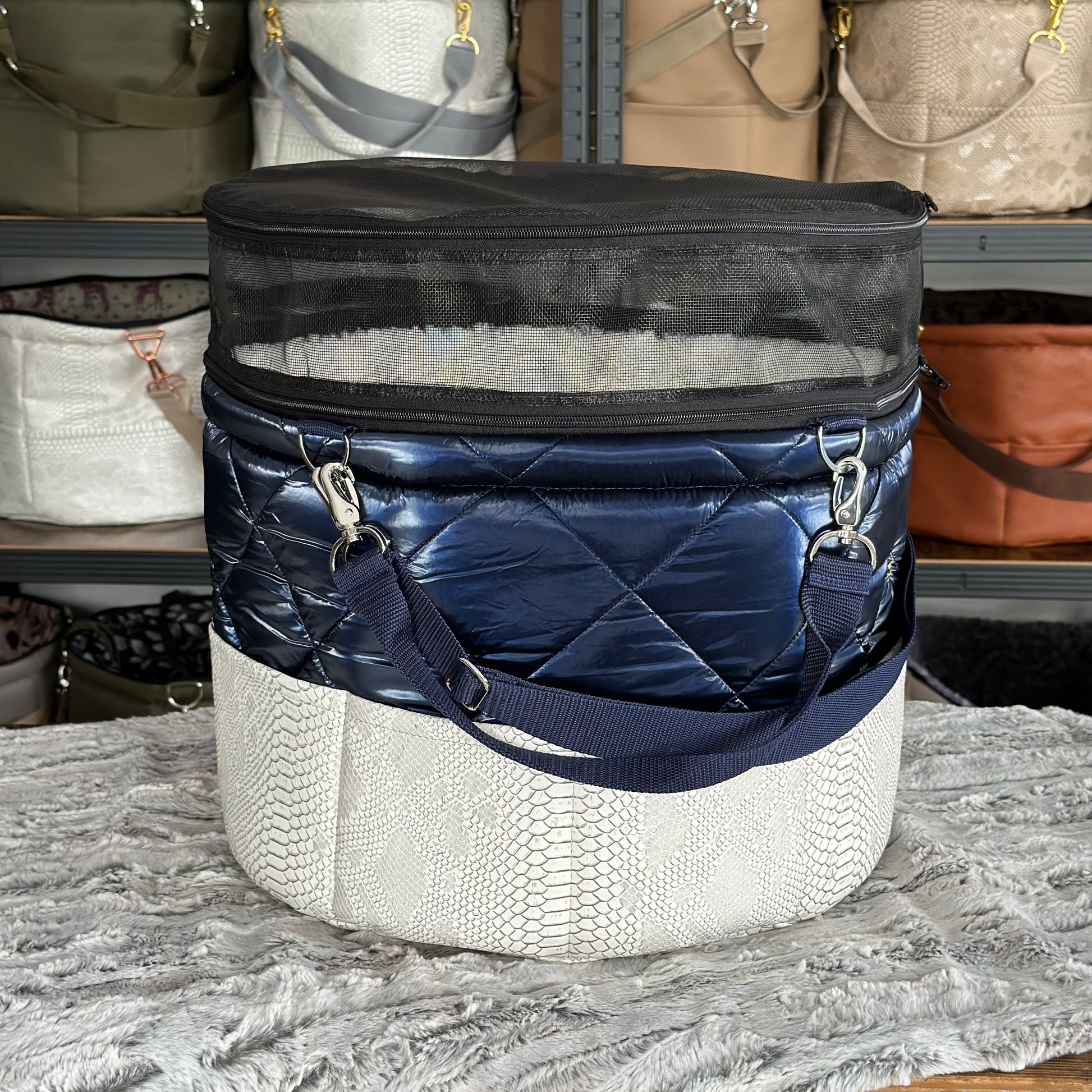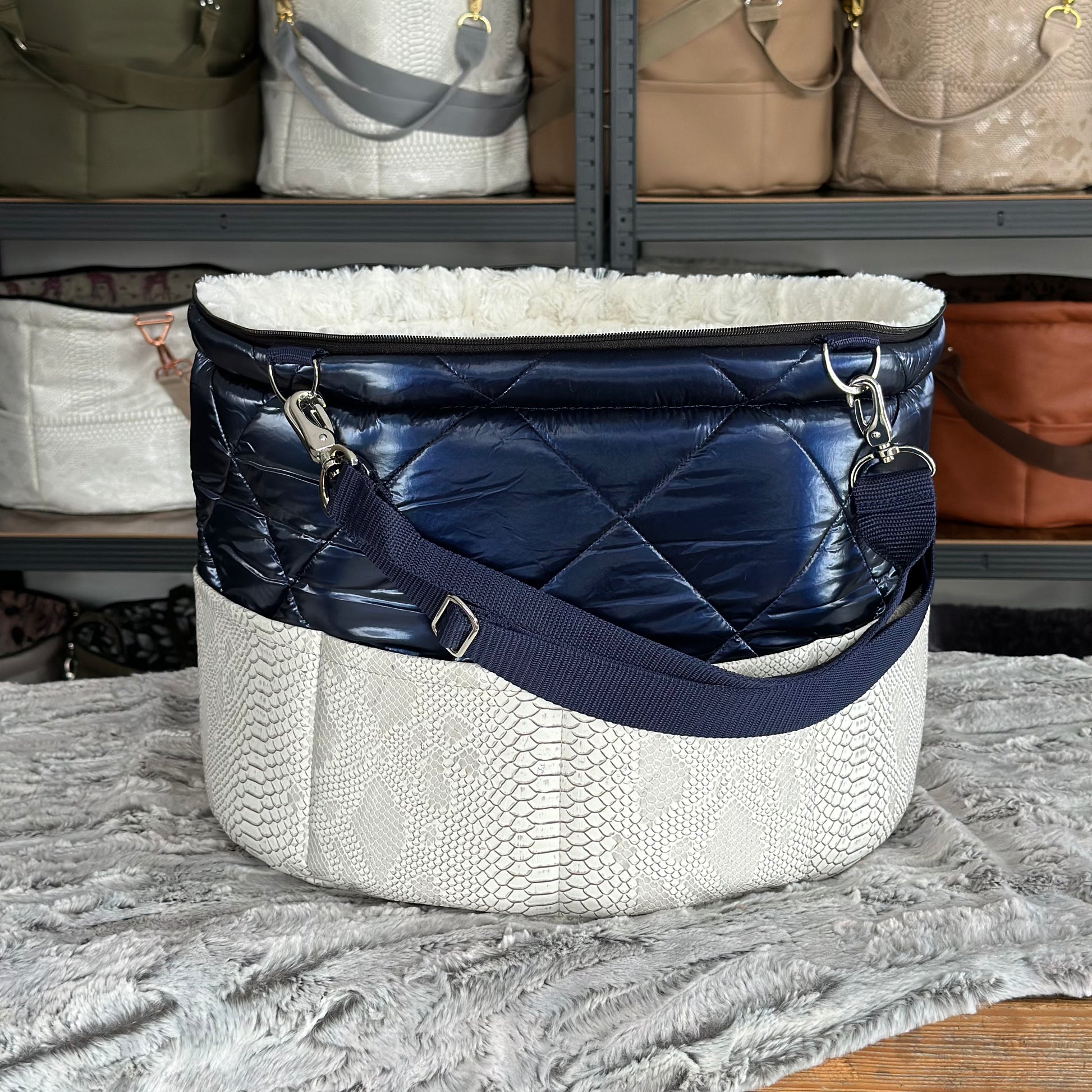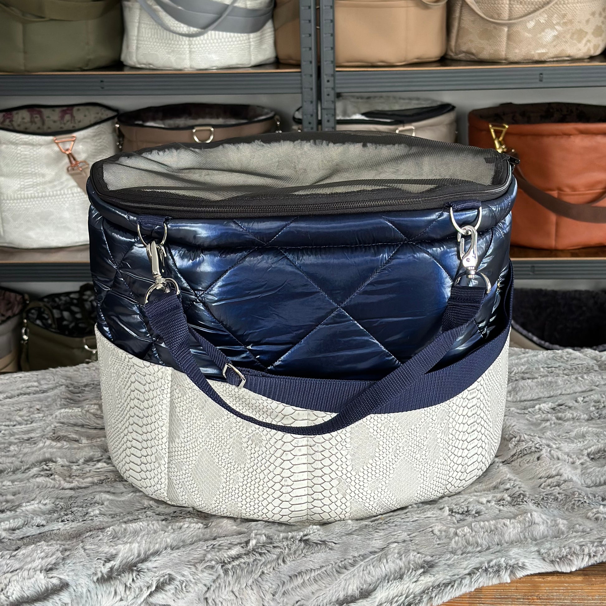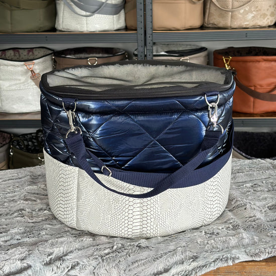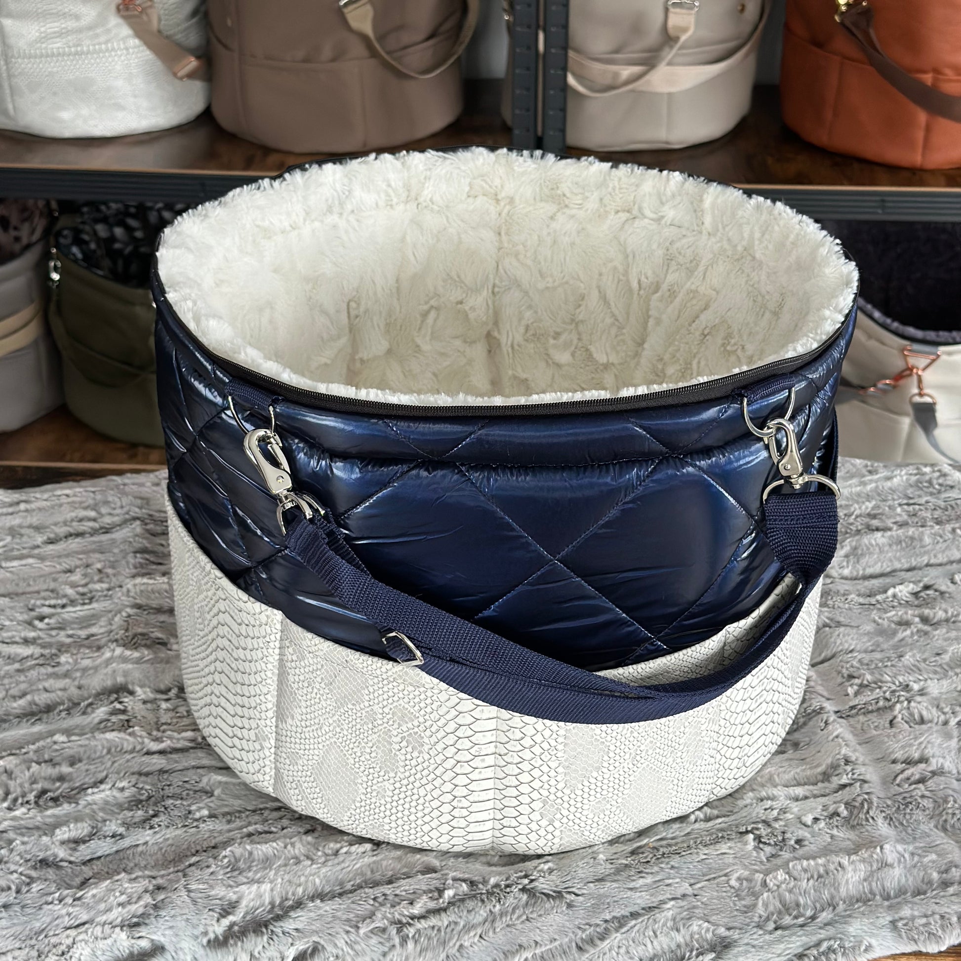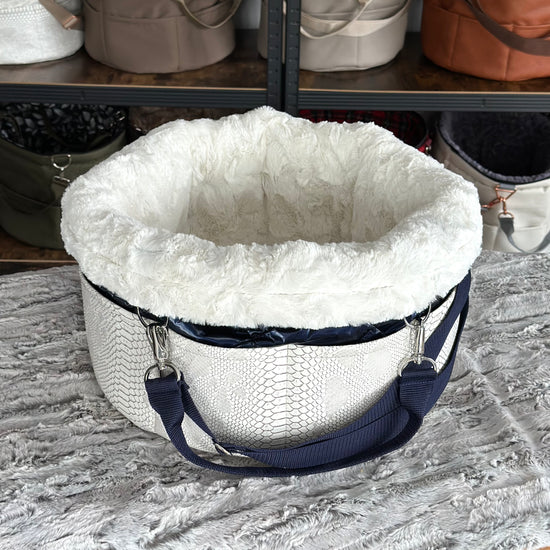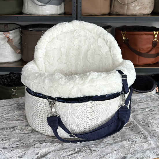 Materialbeschreibung: - Kunstleder Croco white-Stepp blue / Kunstfell Sola / Hardware silberlook / Einlage: Kunstfell Sola / Traveller+Erhöhung / Decke