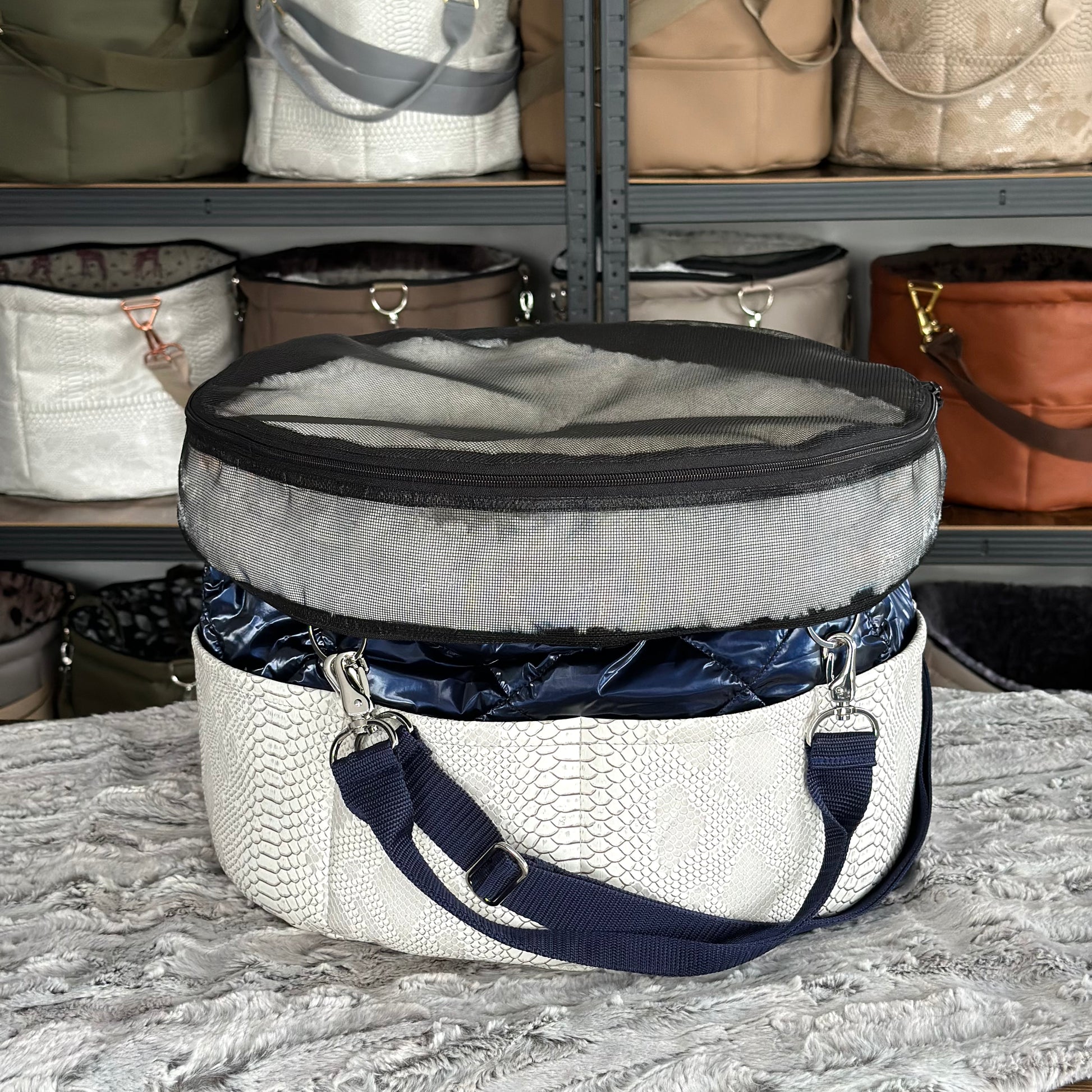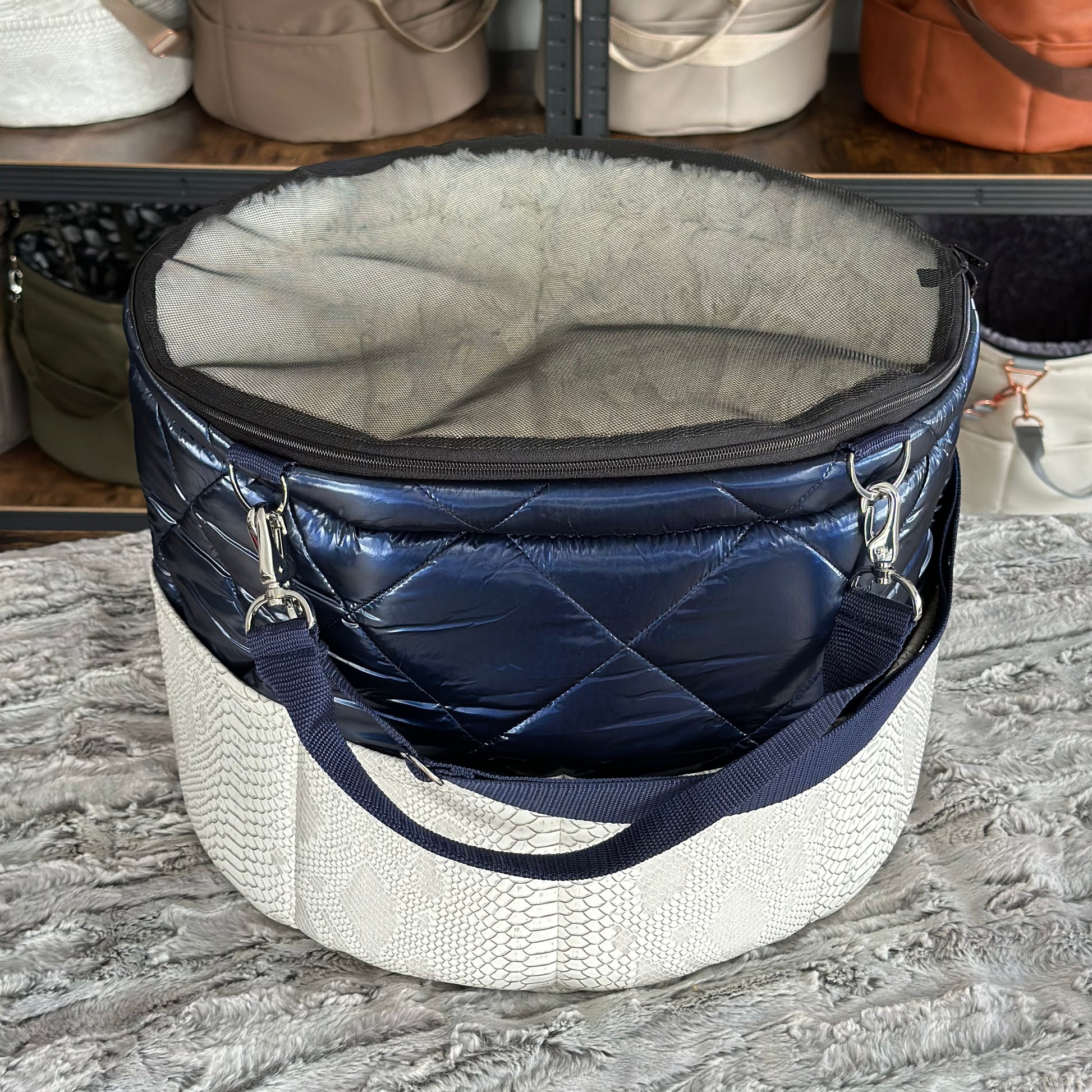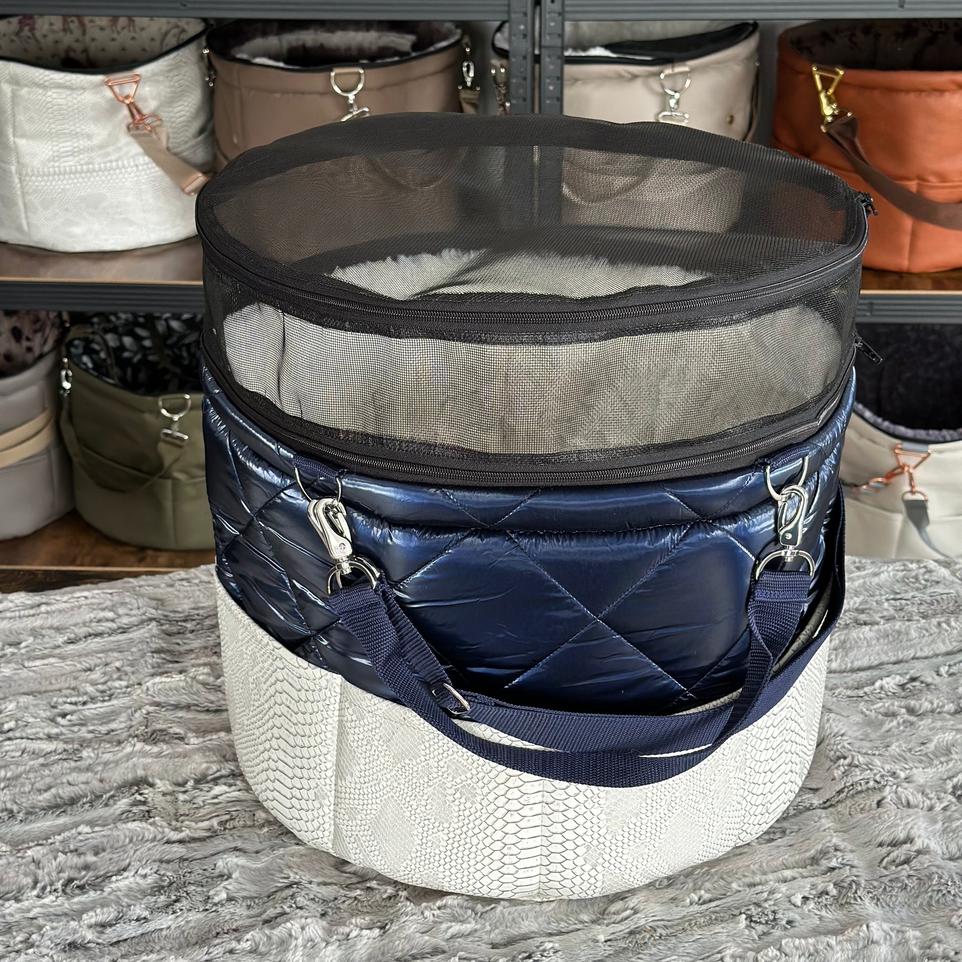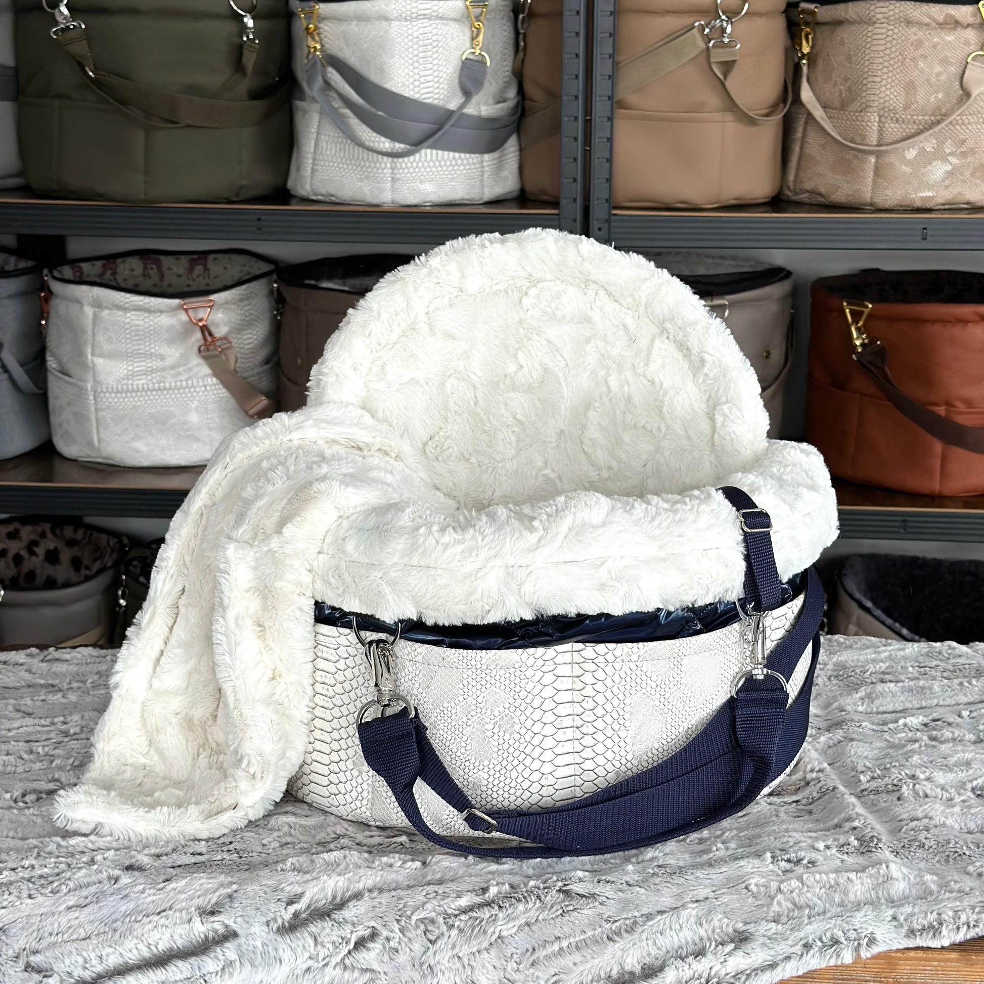 Materialbeschreibung: - Kunstleder Croco white-Stepp blue / Kunstfell Sola / Hardware silberlook / Einlage: Kunstfell Sola / Traveller+Erhöhung / Decke