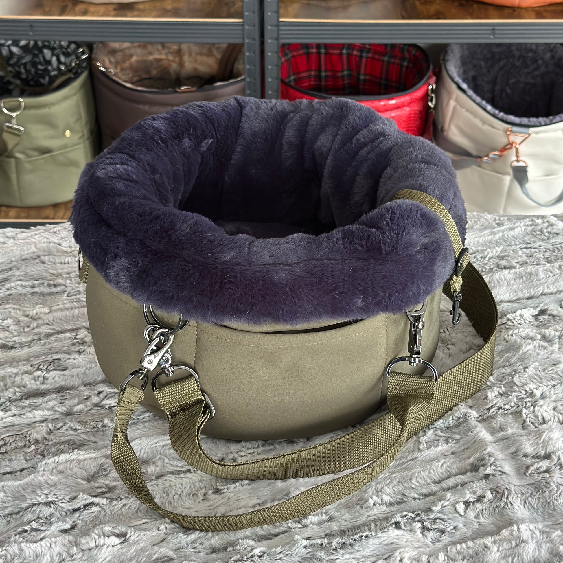 Materialbeschreibung: - Softshell Oliv / Kusntfell Pandora / Traveller + Erhöhung / Komfort / Carausstattung / Einlage / Hardware Silber